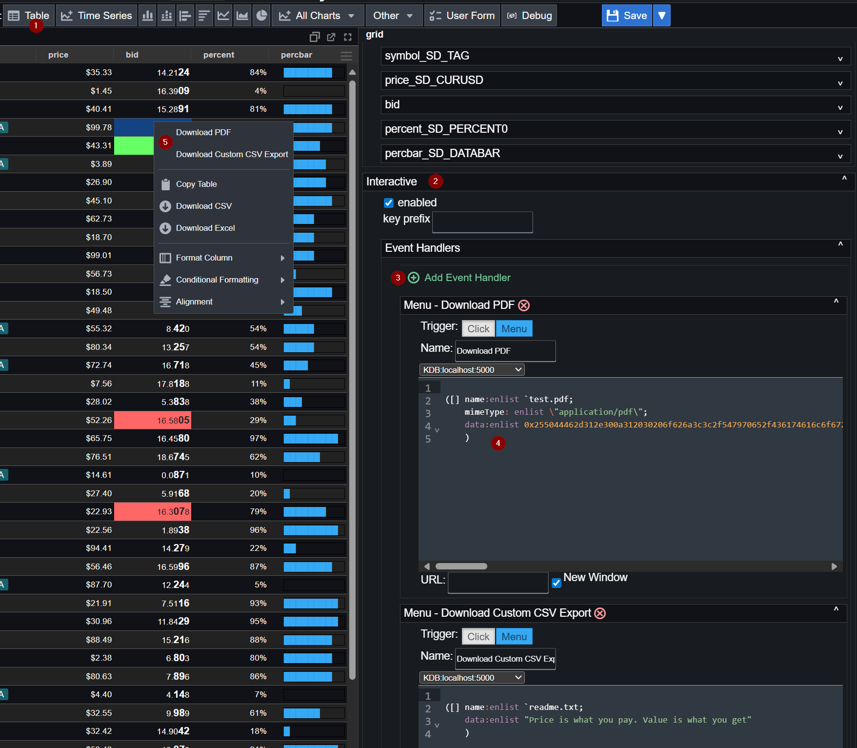 To achieve this we use event handlers. Event handlers can trigger file downloads for the user. These work by the author returning a particular table structure from any action. This enables you to provide PDF downloads, custom text downloads or any form of download where you can fully control the content.