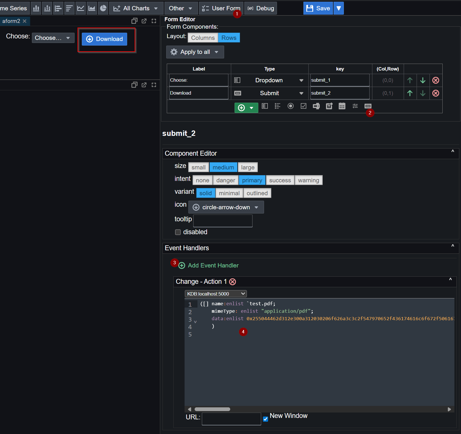 data (Required) | Text string, kdb byte array or "base64," encoded string. | The content of what will be downloaded. |