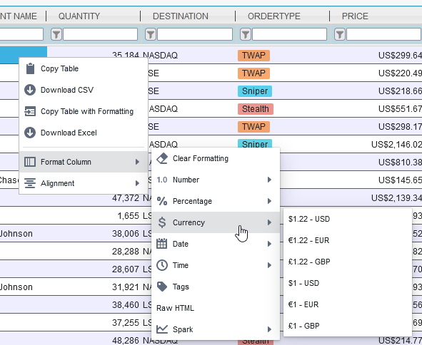 - Right-Clicking on the column and selecting a formatter.