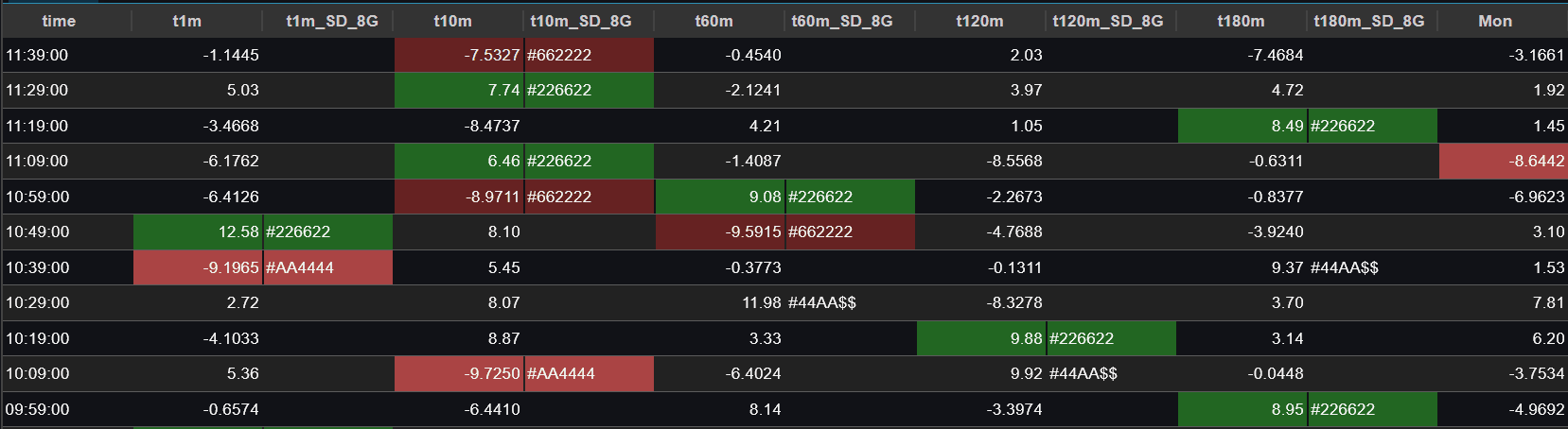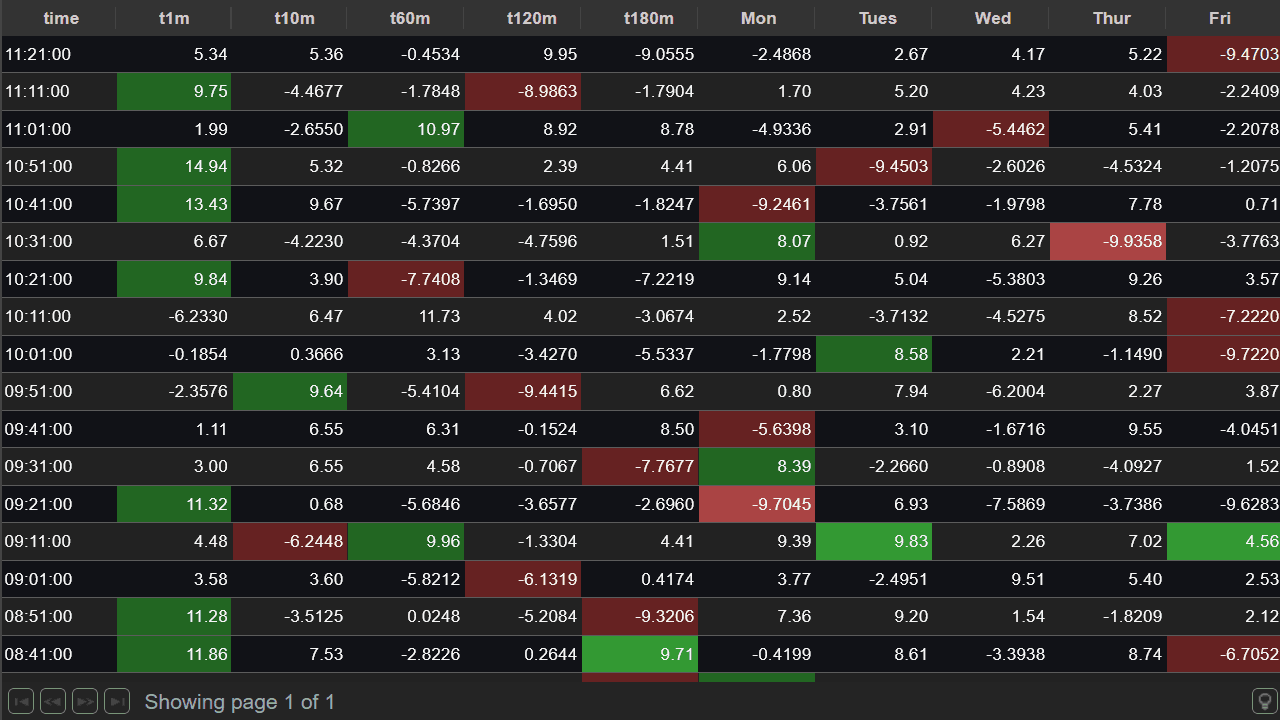 Pulse provides conditional formatting with the UI to solve most use-cases but when you want highly customized per cell highlighting you can use the row formatting to control the foreground and background color of each cell. Combined with the dynamic strength of kdb+ this allows powerful reusable analysis.