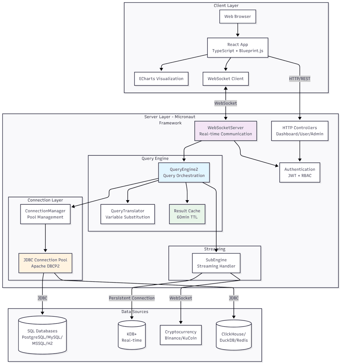 queryEngine.tsx: Manages query execution lifecycle, caching, and WebSocket communicationqueryModel.tsx: Defines data models for queries, results, and configurationsqueryTranslator.tsx: Translates user variables and parameters into SQL querieschartResultSet.tsx: Transforms database results into chart-compatible formatsViewStrategy.tsx: Determines how to render results (chart, table, metric, etc.)